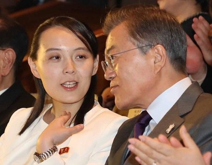 문재인 대통령이 2018년 2월 11일 오후 서울 중구 국립중앙극장에서 김여정 노동당 중앙위원회 제1부부장과 대화를 나누고 있다./뉴시스