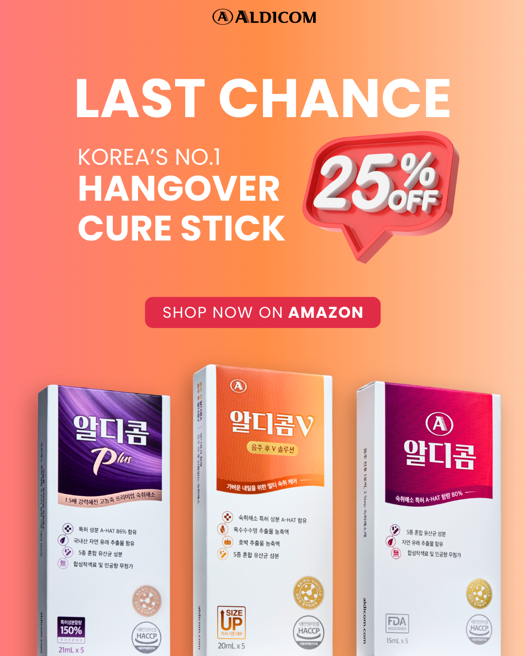 - ALDICOM PLUS - 숙취해소제 특허성분 고농축 함량 (26% 할인) : https://www.amazon.com/ALDICOM-Pre-Alcohol-Supplement-Fast-Acting-Science-Backed/dp/B0DTYN76WB/ref=sr_1_1?dib=eyJ2IjoiMSJ9.1mpVT9iwZT3lJCBMK5EEoDq2IuyYXYHdrQYkv2enRO2Vo_xw3RTuV98DWt5mc2Qw.374dEb0284DPewp0IG-1iBcKYxt5pAV6fd6gvEnGO6Y&dib_tag=se&keywords=aldicom&qid=1752220769&sr=8-1