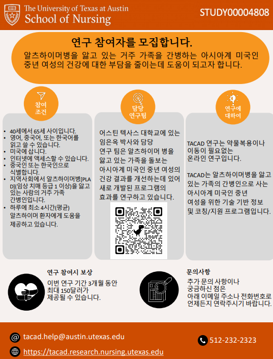 저희는 "알츠하이머 가족 간병인인 아시아계 미국인 중년 여성을 위한 기술 기반 정보 및 코칭/지원 프로그램"에 대한 연구를 진행 중에 있습니다. 저희는 연구에 등록할 참가자를 모집하고 있습니다. 1) 알츠하이머병 환자의 가족 간병인이고, 2) 영어, 중국어 또는 한국어를 읽고 쓸 수 있으며, 인터넷에 접속할 수 있고, 3) 자신의 세부 민족이 한국인 또는 중국인인 40세에서 65세 사이의 아시아계 미국인 중년 여성을 찾고 있습니다.