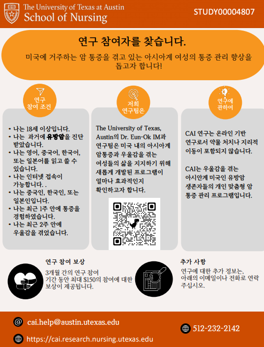 이메일: cai.help@austin.utexas.edu 전화: 512-232-2142 링크: https://cai.research.nursing.utexas.edu/