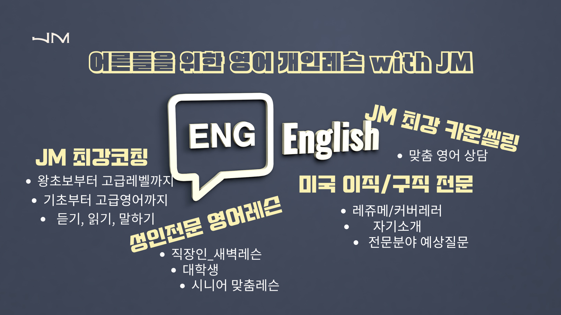 #성인전문영어 #1대1개인레슨 #영어완전정복 미국이직 #미국직장구하기 #영어로말하기 #영어회화 #화상수업 #어른들을위한영어개인레슨WithJM