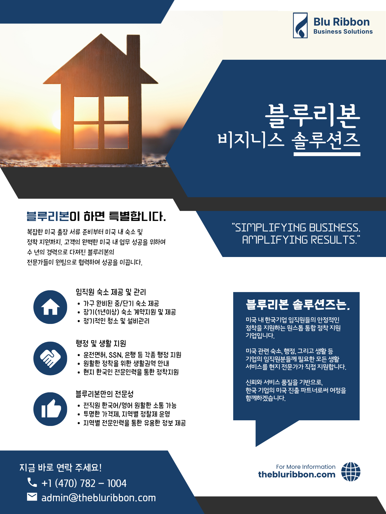 저희 블루리본은 미국 전역에 진출하는 한국 기업들의 성공적인 현지 적응과 운영을 지원하는 비즈니스 솔루션 기업입니다.